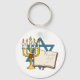 This design is the star of david. The star has a candle holder in front of it and a book with a passage. This star of david design looks great on this Keychain