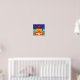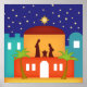 A modern folk art style design with a colourful city of Bethlehem. A silhouette of the holy family with Joseph and Mary overlooking baby Jesus in the manger. The evening sky is a beautiful dark blue with the star of the East shining above. Smaller stars surround the sky.