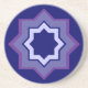 This coaster features an abstract pattern of clustered eight sided stars in colours of mauve, purple and white on a midnight blue background.