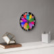 This wall clock has a mid-century modern design of a wreath made up of stars in shades of red, orange, yellow, green, blue, and purple.
