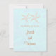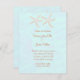 Sandy brown starfish on pale blue background are featured on this beach wedding invitation