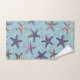 Poisson d'étoiles dans le sable avec ensemble de serviettes de bain Coralize. Éleveurs colorés en violet, rose, gris et brun sur un arrière - plan turquoise à texture bleue et violette. L'ensemble est agrémenté de coralize, corail dans les tons violets. Océan, bord de mer, plage nautique maison de salle de bain inspiré.