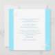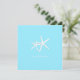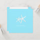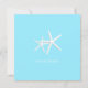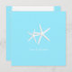Aqua beach wedding invitations. Two white starfish on blue decorate the front of this square, flat invite with a place to add bride and groom names in white script font. Reverse has custom lines of matching blue template text on a white centre panel.