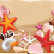 A vibrant arrangement of seashells and starfish on a sandy beach background.