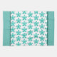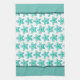 Shown on a white towel, this kitchen towel has images of starfish in the aqua and teal colours.