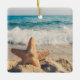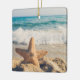 An ornament with a scenic photo. A big starfish set upright on a sandy beach. A beautiful blue sea with waves of white surf in the background.
