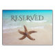 Beach wedding, reserved seating card. A single brown starfish / sea star, on a tropical beach scene background image, with "reserved" text in black. Save seats for members of the wedding party, family, or special guests.