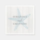 Custom Beach Wedding Cocktail or Dinner Napkins with a light rustic wood background and vintage starfish illustration with personalized names, perfect for a tropical destination wedding or beach theme bridal shower.