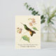 Post card with a vintage natural history illustration by Antoine-Germain Bevalet, c.) A green hummingbird with a purple throat patch and gold tail feathers perches on a tropical wigandia plant with pink flowers, on a light golden yellow parchment texture background. Digitally cleaned and enhanced while still retaining its vintage characteristics. Features common and scientific names in decorative fonts. Matching U.S. postage stamps available.