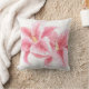 Pillow printed with stargazer lily flowers in shades of pink on white background, from original watercolor painting.