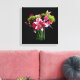 A stargazer lily bouquet is a bright splash of pink and green on a dramatic square black background. Spider mums, gerbera daisies and pink and white carnations round out the bouquet. Lilium 'Stargazer' (the Stargazer lily) is a hybrid lily of the Oriental group. Oriental lilies are known for their fragrant perfume, blooming mid-to-late summer. The Stargazer lily was created in 1974 by Leslie Woodriff, a lily breeder in California. Woodriff called the new cross 'Stargazer', because the blooms faced towards the sky. As beautiful as they are, stargazer lilies are toxic to cats, so keep them away from your feline friends. This photograph is rendered in a watercolor style.
