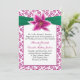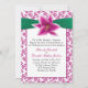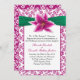 Elegant floral wedding invitation, with a violet pink on white floral damask pattern, graphics of a green ribbon and a lovely stargazer lily bloom. A pink framed white text area, has black and pink text ready to personalize for your special day. Matching products are available.
