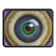 Just the iris and pupil of an eyeball. The iris is formed of three concentric rings, each inset deeper than the last. The outermost is white with yellow-brown striations. The middle is dark blue with white to light blue striations. The green centre is overcome with yellow striations. The pupil is small round and black.