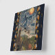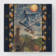 This Halloween clock shows a witch outlined in stars flying across the Halloween night sky over fields of pumpkins, with black cat and owl. The design is from a 1913 Halloween card.