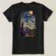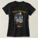 Womens Halloween T-Shirt with a star-studded witch flying across the night sky over fields of pumpkin, with a black cat, an owl, a bat, and a moon that looks like a pumkin. This is a vintage 1913 Halloween design.