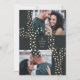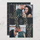 An elegant and unique holiday photo card design featuring two horizontal or landscape oriented photos aligned at the corners, with "JOY" overlaid in starry lettering on a contrasting dark charcoal background. Personalize with your family name and the year in the centre.