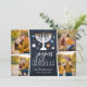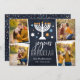Festive Hanukkah photo card features four photos in a collage layout, with "joyous Hanukkah" in white lettering on a navy blue background accented with a lit menorah and white, blue and gold stars. Personalize with your names beneath, and add an additional photo to the back.