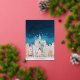 A peaceful winter townscape illustrated in gentle pastel colors, filled with cozy details and a timeless festive charm