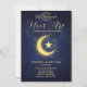 This stunning invitation features a deep navy blue background with a glowing crescent moon and star, set against a beautiful geometric "starry night" constellation. Perfect for inviting friends and family to your Eid al-Fitr or Eid al-Adha celebration.