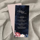 This Starry Night Floral wedding menu inspires either a midnight summer theme or a dark winter of snow theme, making it a seasonally versatile design. The navy blue, almost black, watercolor with a celestial star or snowflake filled sky, combined with the pop of minimal pink flowers and calligraphy is sure to speak to the magic of your marriage celebration, regardless of the time of year.