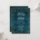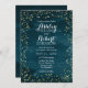 Starry Night Wedding Invitation. Stars in the night sky frame this elegant evening wedding theme wedding invitaiton. Stars in faux gold on a deep blue teal watercolor background allows the white wedding text to stand out.