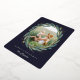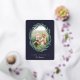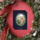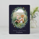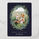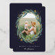 Send holiday greetings to friends and family in chic style with our elegant photo cards. your favourite vertical or portrait oriented image is framed by an oval laurel wreath of green watercolor eucalyptus leaves and gold foil stars on a dark background. Customize with your custom holiday greeting and names beneath in off-white lettering.