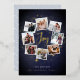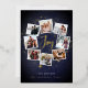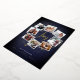 A festive holiday card design that features eight of your favourite photos arranged in a round wreath design accented by gold foil stars on a midnight blue background. "Joy" appears in the centre in gold foil hand lettered brush script typography. Personalize this unique holiday photo collage design with your custom Christmas greeting and names at the bottom.