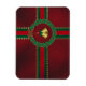 Golden bells hanging in the centre of a holly wreath of dark leaves and red gems for berries, intersected by ribbons of red and green edged with gold stars. Like a Christmas present wrapped in dark red and tied with bright striped ribbons.