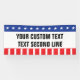 Stars and stripes banner with your custom text has room for 2 lines. Blue stripe with white stars at top, red on white stripes at bottom. Attention getting banner for business or event.