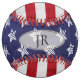 This American flag regulation softball features a stylized representation of the USA flag with red and white stripes on one strip of the softball's cover and white stars on blue on the other strip, blended with a subtle digital texture - customize with his or her initials - by katz_d_zynes
