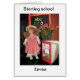starting school have lots of fun text with little blond haired doll in Victorian style school uniform with blackboard and flowers