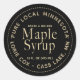 Customize this label with your state name in curved text along the top of this label. Simple and Elegant Round Black Maple Syrup Label with the words "Maple Syrup" in an embossed metallic gold font. Dashed line border in gold.