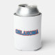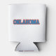 This custom can cooler features a design that displays the word "Oklahoma" in a Boxing print font with aqua blue letters orange coloured outline in this custom state pride jersey style theme. Our can coolers fits any standard 12 oz cans and is customized on all sides including the bottom and made with high-density open-cell polyurethane collapsible foam material for easy storage.