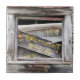 The remains of an old sign in the window of a dilapidated barn.