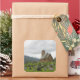 Square sticker of a wooden stave church with tombstones and graves on a graveyard at the edge of a fjord between the mountains in Gaupne, Sogn og Fjordane in Norway.