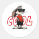 A cartoon bunny dressed in a red t-shirt, black shorts, and dark sunglasses stands confidently with hands in pockets. The word "COOL" is boldly written in red behind the bunny, highlighting its laid-back and stylish attitude. The glittery black background adds a fun and vibrant effect to the overall design.