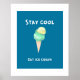 Stay Cool, Eat Ice Cream! Motivating and inspiring quote with a blue background, and a yummy ice cream. Ice cream, juicy, colourful watercolor illustrations, and sweet decorations.