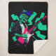 A robotic skeleton with a punk-style blue mohawk plays a bright pink electric guitar that emits electric energy waves when played. the robot wears a black leather jacket.