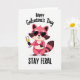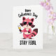 This greeting card features a white background with a cartoon raccoon right in the center, dressed in a hot pink bikini and smiling wide. The raccoon’s fur is shaded in soft pink tones, and it wears black heart-shaped sunglasses that hide its eyes and add a fun, confident look. In one paw, it holds a champagne flute filled with golden bubbly, with a tiny star-like sparkle on the glass. Across the top, the text “Happy Galentine’s Day” curves overhead in a cursive-style look, standing out clearly against the white space. Near the bottom, “STAY FERAL” appears in all caps with thick, simple lettering that feels direct and cheeky. It’s a sweet choice for a friend because it mixes affection with a little humor, like saying, “I love you, and I love your wild side too.” 🥰❤️ Hope it helps you share your Valentine’s Day sentiments.