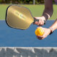 This Pickleball paddle features a gold and bronze design with the hint of a rainbow inspired by the refraction of sunlight through a crystal. It is a winning golden glow when customized with your Name or Text on each side. For a dazzling match, serving what you bring.