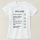 Stay Safe Social Distancing T-Shirt with green check marks to remind yourself and others. Has the words "wash your hands", "cough or sneeze into a tissue or sleeve", "disinfect surfaces", "stay home when sick", "practice social distancing".