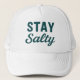 Whether you're salty from the sea breeze, a surf session, or just full of salty attitude, this graphic print 'Stay Salty' hat is for you. The lightly distressed teal vintage and modern fonts create a subtly sarcastic statement. Perfect for anyone who lives in flip flops and a laidback coastal mindset. | This design is available on multiple hat styles. Choose a trucker, dad, snapback, or bucket hat from the Product Style menu above.