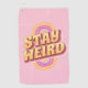 Abstract retro style grunge "Stay weird" text design with pink, beige, orange and purple rainbow decoration