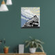 wpa retro vintage style poster illustration of a steam train locomotive travelling with mountain winter scene and sunburst in background