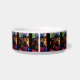 This is a heavy, durable bowl decorated with Tibbies of many colors, the perfect size for hungry/thirsty Tibs. The design is interesting and printing clear.