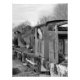A black and white photographic design of old rusting steam trains awaiting restoration.