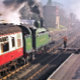 A beautifully restored steam train and carriages of a bygone era leaving the train station and the engine driver hands over the key before being allowed to proceed along the railway. England UK.