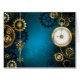 Turquoise, textured, steampunk background with brass and gold gears, a silver key and the clock. Steampunk style.