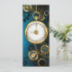 Turquoise, textured, steampunk background with brass and gold gears, a silver key and the clock. Steampunk style.