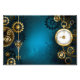 Turquoise, textured, steampunk background with brass and gold gears, a silver key and the clock. Steampunk style.